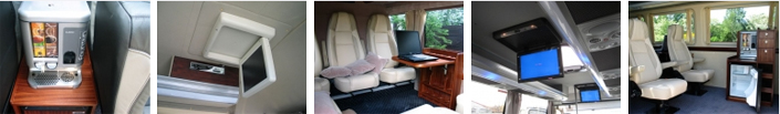 We offer wide range of seats and fabrics. We install various type of electrical devices - CD/DVD/MP3 players, LCD screens, equalizers, loudspeakers, navigation and GPS systems, alarms, wireless internet, TV tuners... Depanding on request we install also refrigerators, kitchen units, furnitures - shalves, tables, racks ...